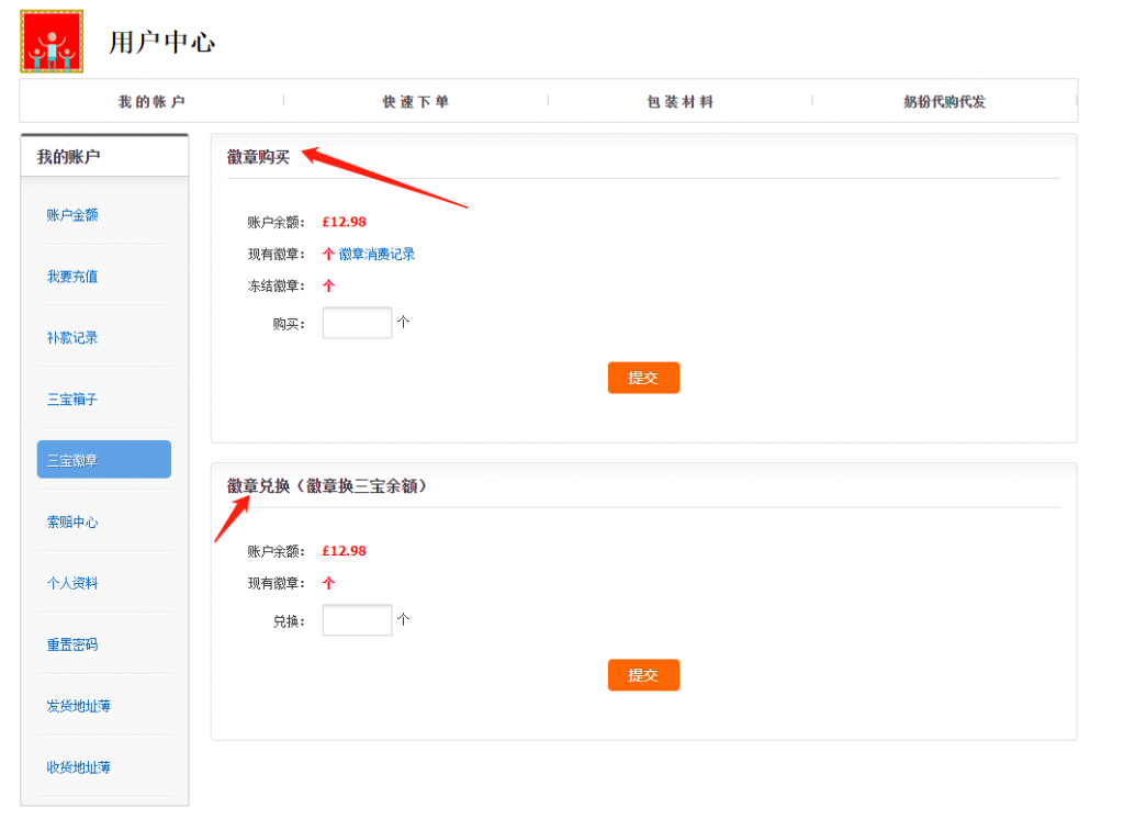 徽章可以通过采购获得,在你需要将徽章变现,退回的资金可以到三宝余额,供你消费使用。