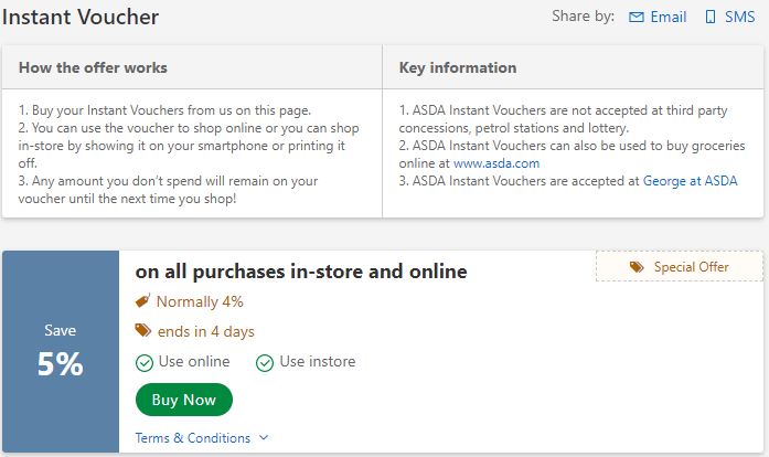 成为三宝会员好处之一,就是能常常有5%off的就会采购Asda instant gift vouchers。