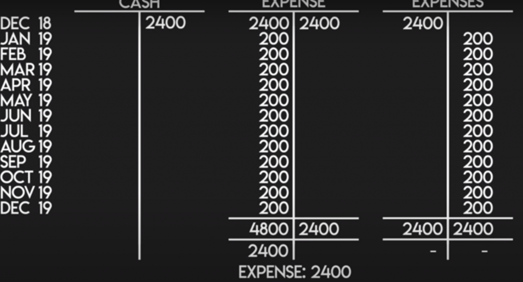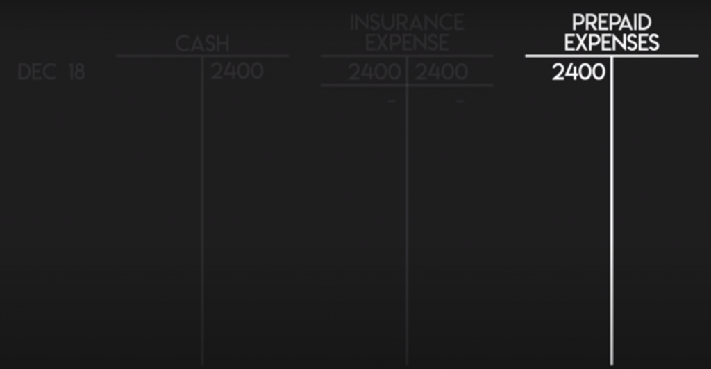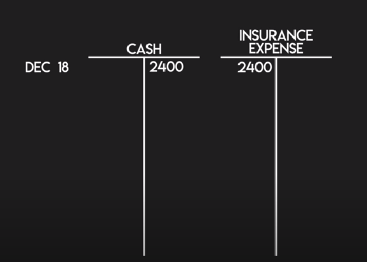 还有车险,我2018年12月支付了2400美元在车险上,我使用科目CASH,CASH是资产,增加记录在debit 方向,减少记录在credit 方向,我减少了2400美元现金。我应该白把2400美元记录在CASH这个科目的credit方向。