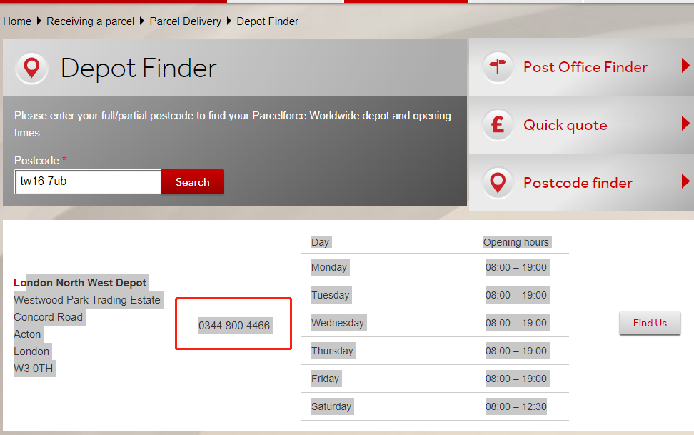 | ndon North West Depot Westwood Park Trading Estate Concord Road Acton London W3 0TH | 0344 800 4466 | DayOpening hoursMonday08:00 – 19:00Tuesday08:00 – 19:00Wednesday08:00 – 19:00Thursday08:00 – 19:00Friday08:00 – 19:00Saturday08:00 – 12:30 |